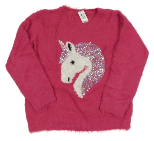 Růžový chlupatý svetr s jednorožem a flitry C&A