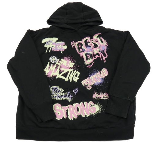 Černá mikina s nápisy a květem a srdíčky a skvrnkami a kapucí PRIMARK