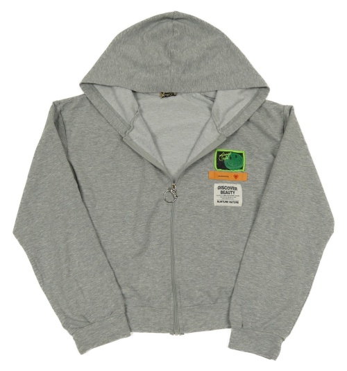 Světlešedá propínací crop mikina s nášivkami a kapucí