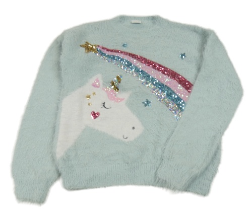 Světlemodrý chlupatý svetr s jednorožcem a duhou z flitrů F&F