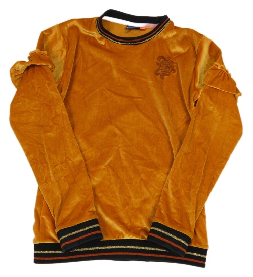 Medovo-černá sametová mikina s nápisy a pruhy a volánky TOM.DU