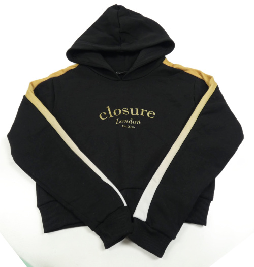 Černá crop mikina s okrovým pruhem a nápisem a kapucí