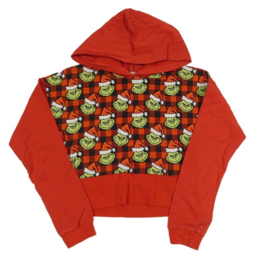 Červeno-kostkovaná crop mikina s Grinchem a kapucí