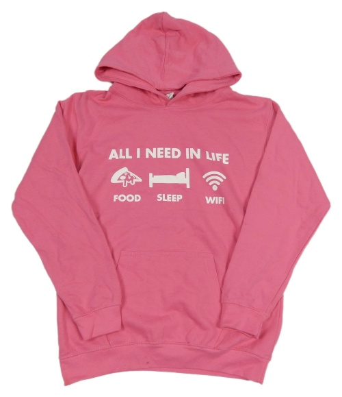Růžová mikina s nápisy a obrázky a kapsou a kapucí AWDis