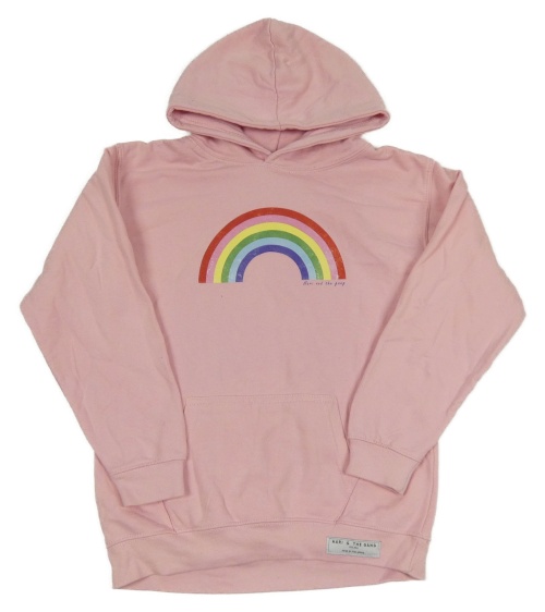 Světlerůžová mikina s duhou a kapsou a kapucí