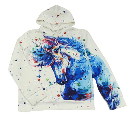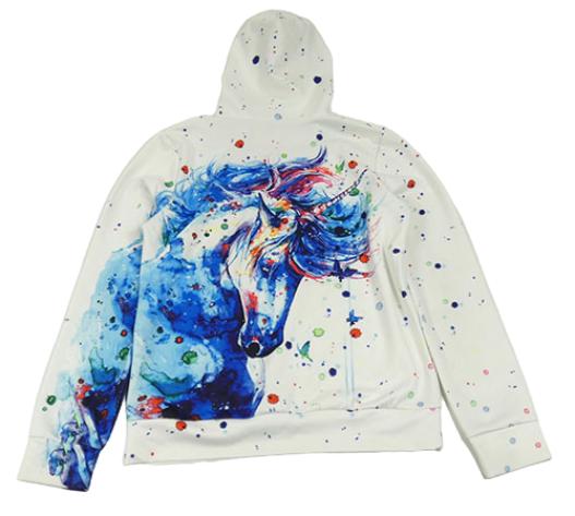 Bílá skvrnitá mikina s jednorožcem a kapucí