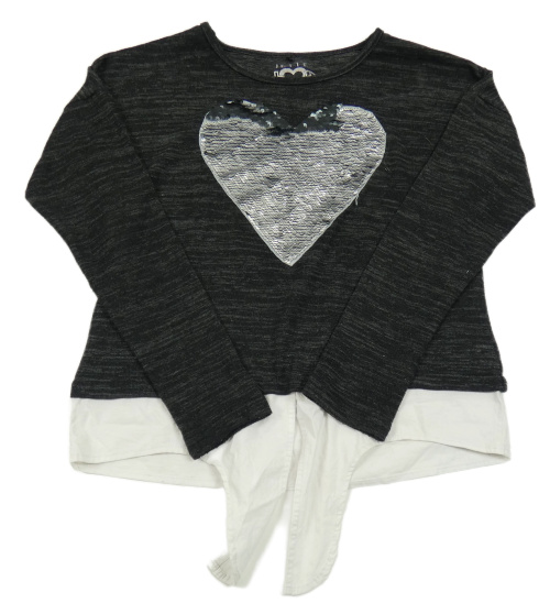 Tmavošedý svetr se všitou halenkou a srdíčkem z překlápěcích flitrů Staccato