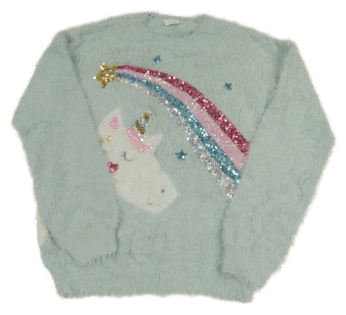 Světlemodrý chlupatý svetr s jednorožcem a kometou z flitrů F&F