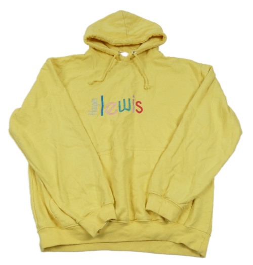 Žlutá mikina s nápisy a kapsou a kapucí