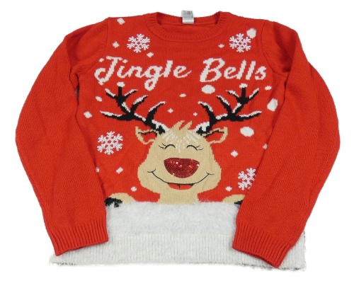 Červeno-bílý svetr se sobem a vločkami z flitrů C&A