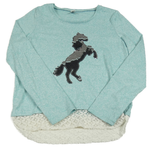 Mentolové melírované úpletové mikinotriko s koníkem z překlápěcích flitrů a krajkovým volánkem YIGGA