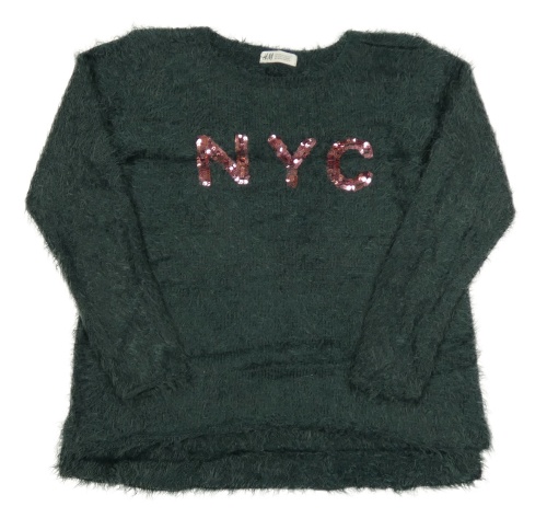 Tmavozelený chlupatý svetr s písmeny z flitrů H&M