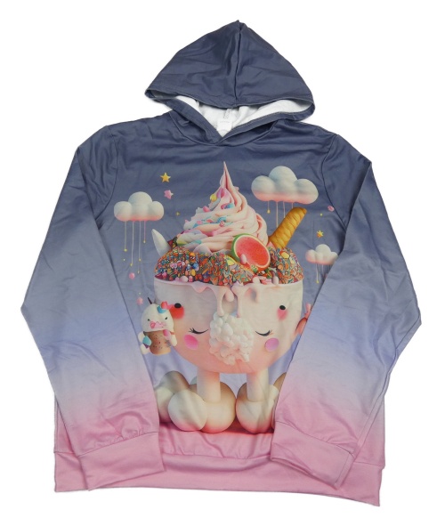 Modrošedo-lila-růžová ombré mikina se zmrzlinovým pohárem a kapucí