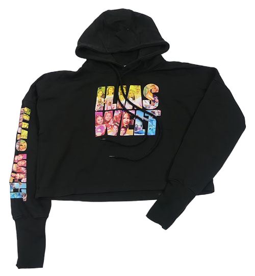 Černá crop mikina s nápisy s dívkami a kapucí