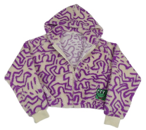Smetanovo-fialová vzorovaná chlupatá crop propínací mikina s nášivkou a kapucí H&M