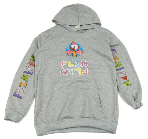 Světlešedá melírovaná mikina s plameňákem a nápisy a kapucí