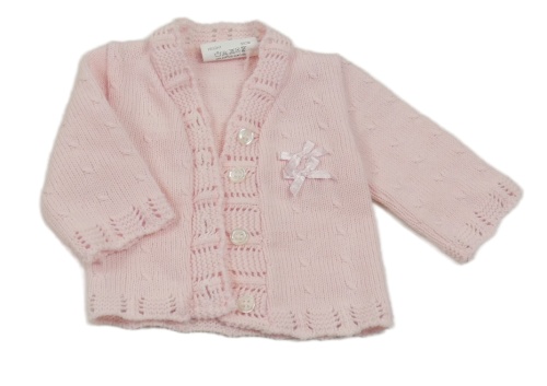 Světlerůžový puntíkatý propínací svetr s mašlemi
