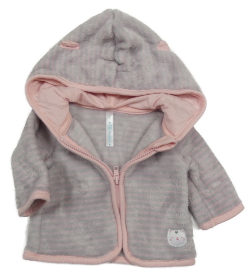 Šedo-růžová pruhovaná chlupatá propínací mikina s kočkou a kapucí