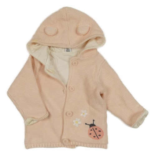 Světlebroskvový propínací podšitý svetr s beruškou a květy a kapucí s oušky dopodopo