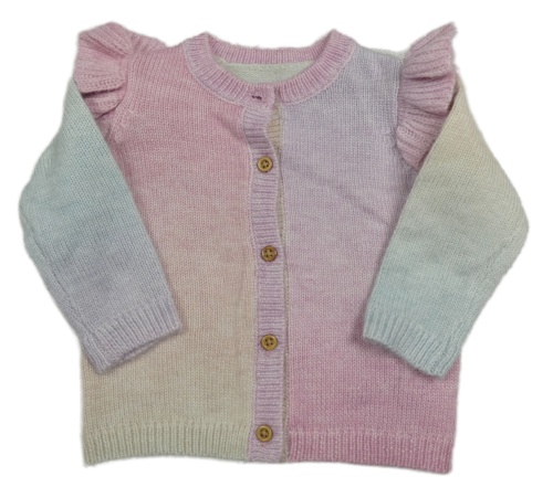 Světlerůžovo-duhový propínací svetr s volánky tu