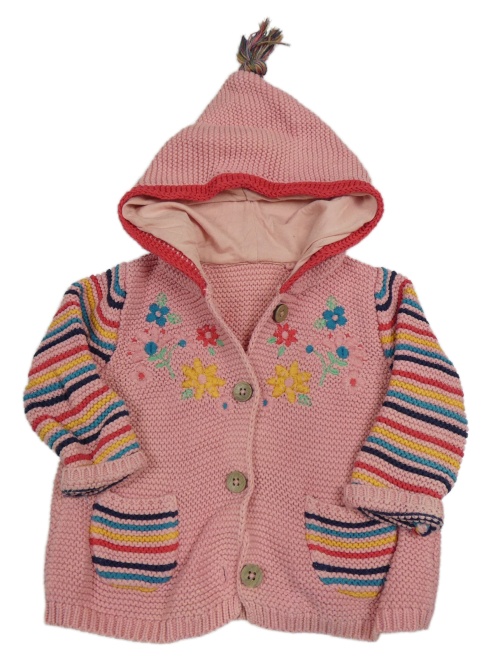 Růžovo-pruhovaný propínací svetr s kytičkami, proužky a kapucí Tu