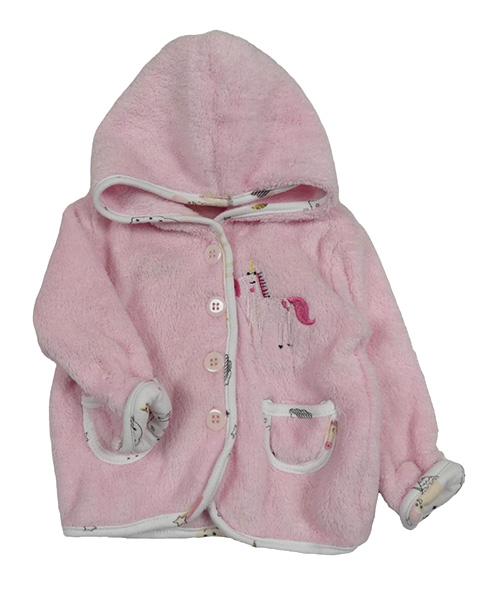 Růžová chlupatá propínací mikina s jednorožcem a kapucí