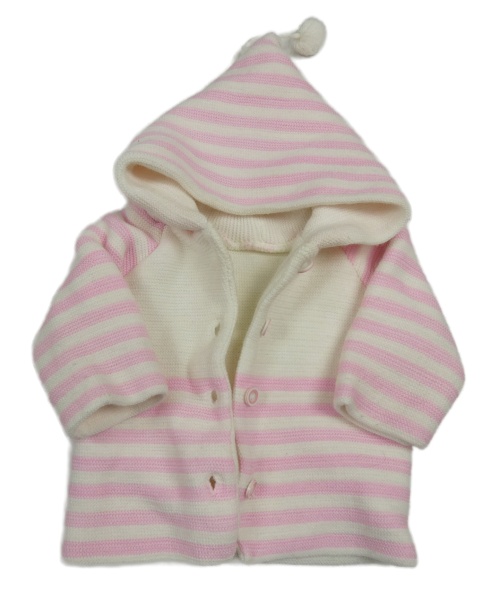 Růžovo-bílý pruhovaný pletený propínací zateplený svetr s kapucí s bambulkami