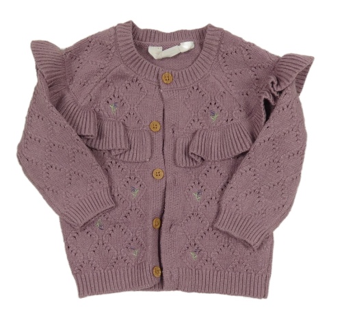 Fialovohnědý károvaný úpletový propínací svetr s kytičkami a volánky PRIMARK