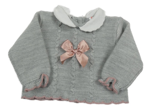 Šedý melírovaný pletený svetr s mašlí a vzorem a límečkem