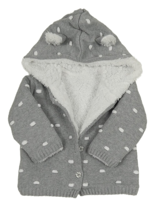 Šedý propínací zateplený svetr s bambulkami a kapucí Matalan