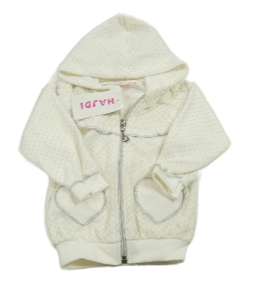 Nové - Bílá puntíkatá třpytivá sametová propínancí mikina s volánkem a kapucí