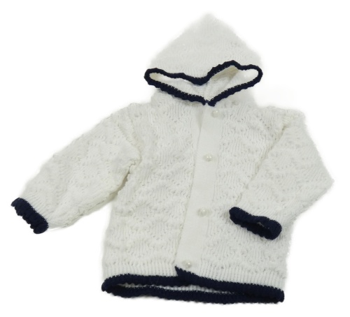 Bílý vzorovaný propínací svetr s tmavomodrým lemem a kapucí
