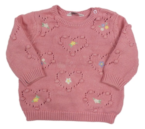 Růžový svetr s perforovanými srdíčky a výšivkami květů
