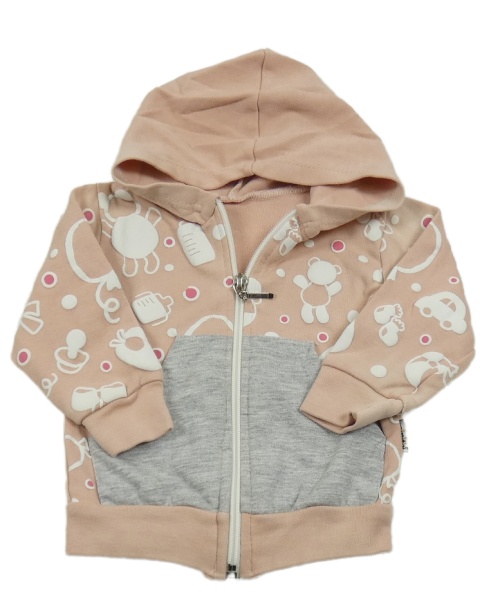 Světlerůžová vzorovaná propínací mikina s šedou kapsou a kapucí