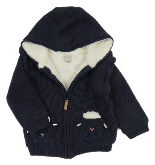 Tmavomodrý propínací zateplený svetr s ovečkami a kapucí John Lewis