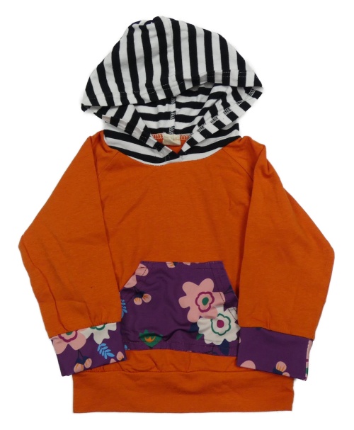 Oranžová lehká mikina s fialovou květovanou kapsou a kapucí