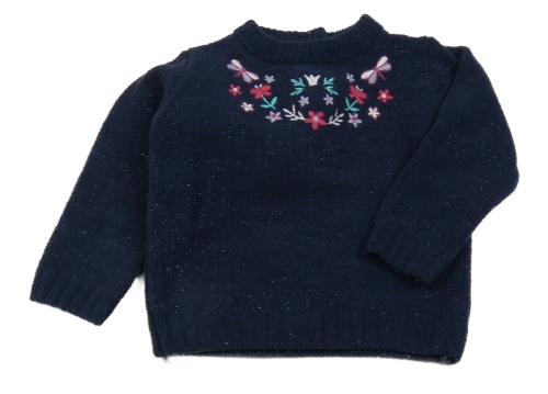 Tmavomodrý žinylkový třpytivý svetr s výšivkou C&A
