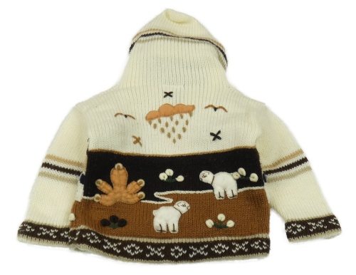 Smetanovo-hnědý vzorovaný propínací svetr s obrázky a kapucí