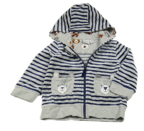 Šedo-modrá pruhovaná sametová propínací mikina s medvědy a kapucí manguun