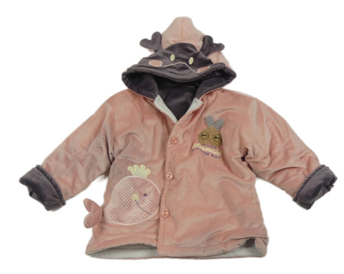 Světlerůžovo-šedá plyšová zateplená propínací mikina s obrázky a kapucí