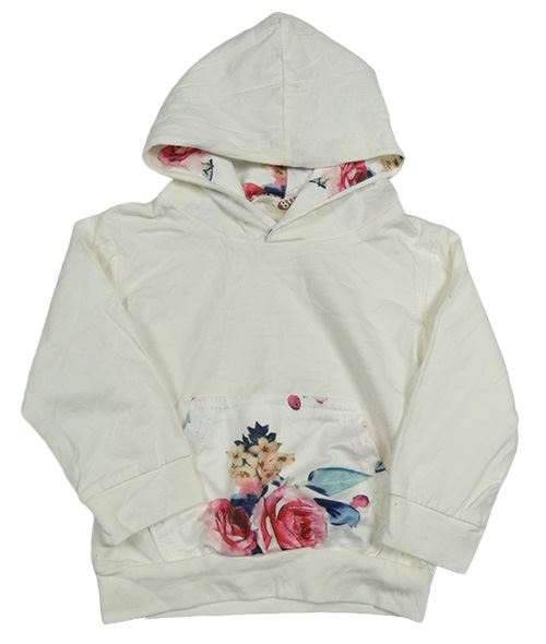 Bílá mikina s kapsou s růžemi a kapucí