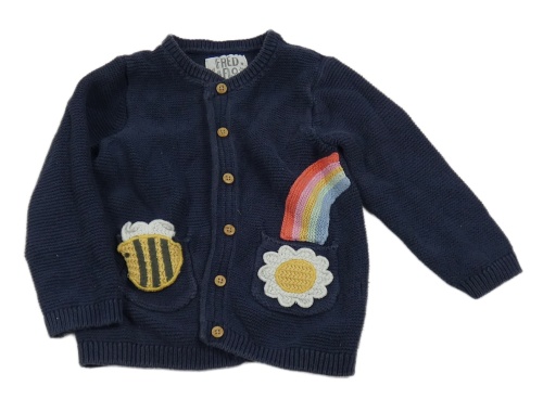 Tmavomodrý propínací svetr s obrázky F&F
