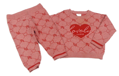 2Set - Jahodový melírovaný károvaný úpletový svetr se srdíčky a nápisy + tepláky RIVER ISLAND
