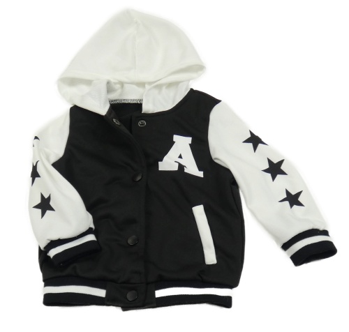Černo-bílá baseballová mikina s písmenem a kapucí