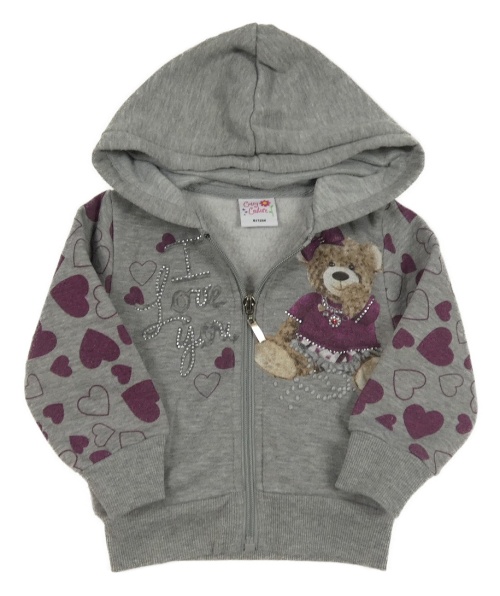 Šedá propínací mikina se srdíčky, medvídkem a kapucí