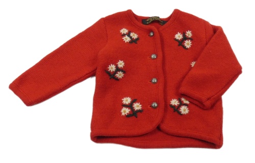 Červený vlněný propínací svetr s kytičkami