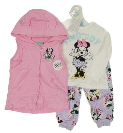 • Nové - 3Set - Růžová propínací tepláková vesta s Minnie a kapucí + bílé triko + světlefialové tepláky Disney
