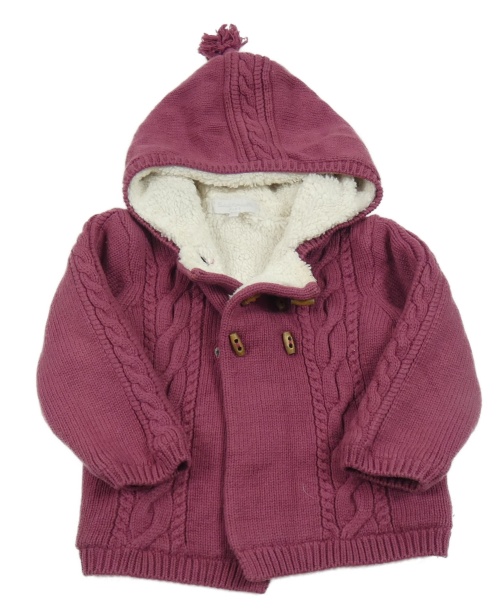 Tmavorůžový propínací zateplený svetr s copany a kapucí