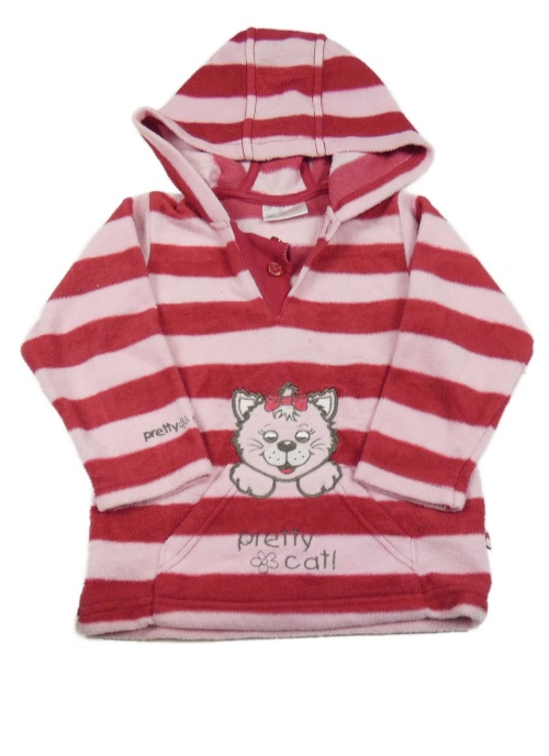 Vínovo-světlerůžová pruhovaná fleecová mikina s kočičkou a kapsou a kapucí