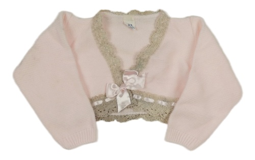 Světlerůžové svetrové bolerko s krajkou a mašlí